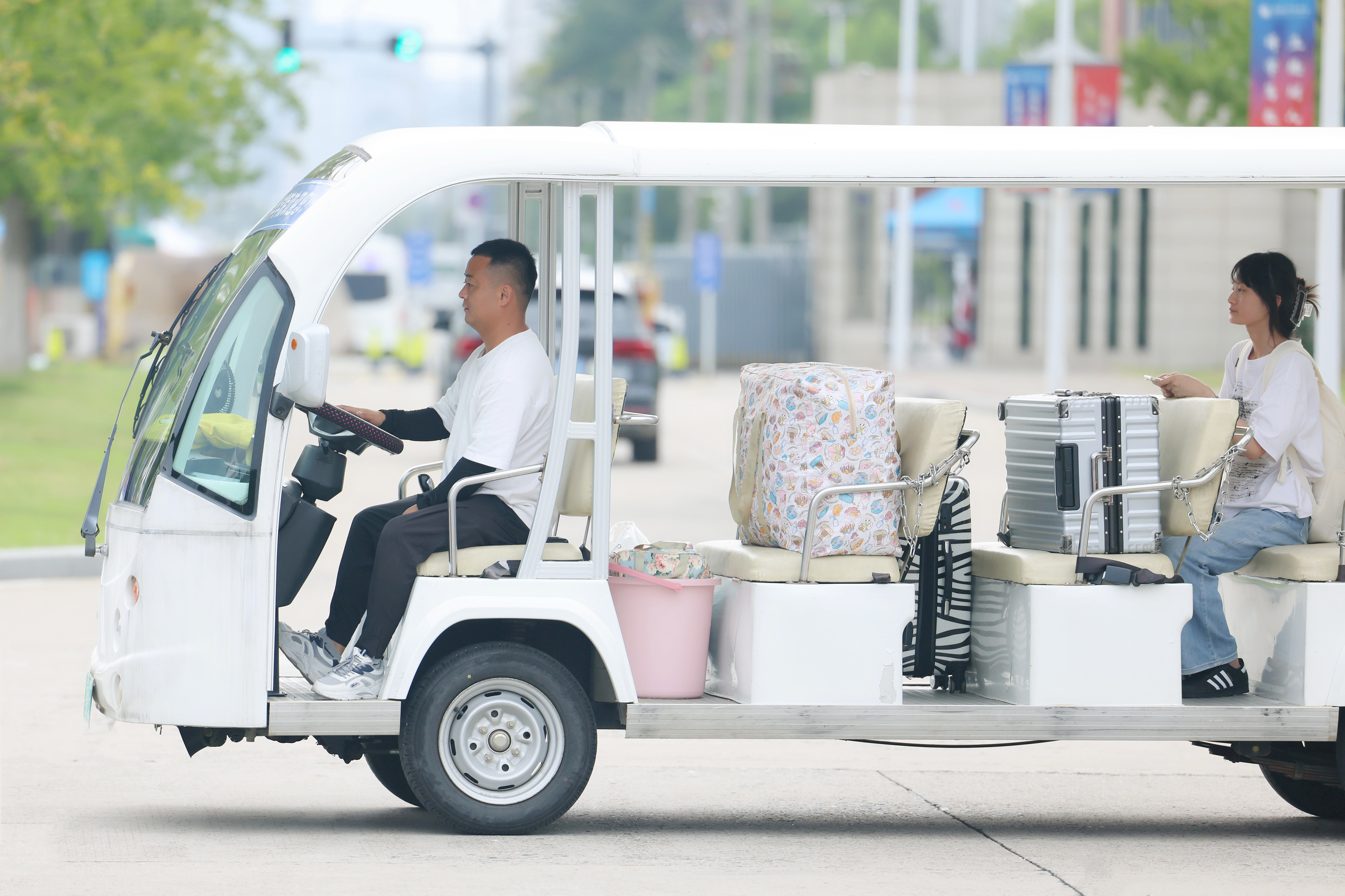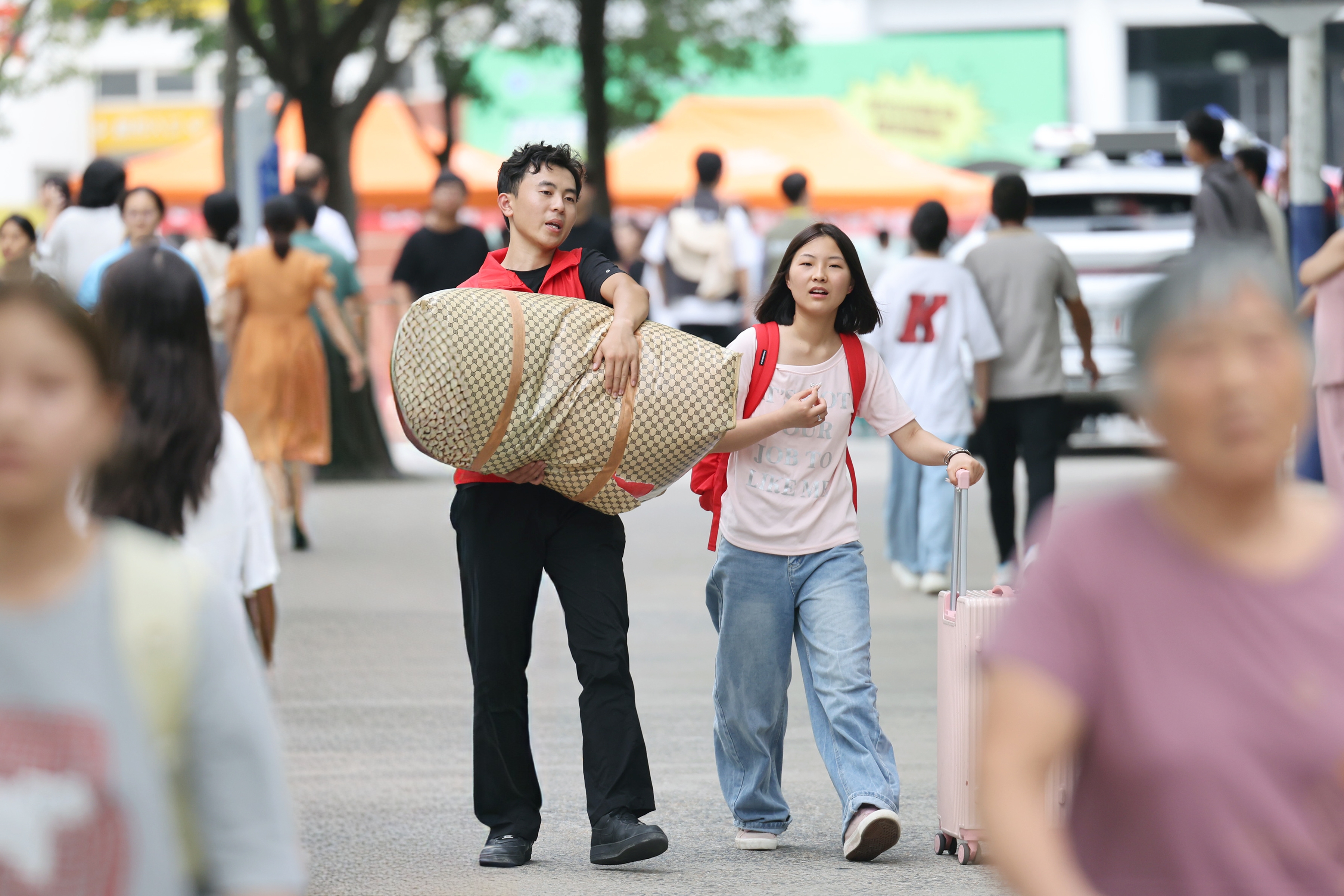 “去年,我来的时候,就是学长帮我搬的行李,今年我也想成为‘志愿红’,把这份温暖传递下去。”大数据与人工智能学院志愿者雷天丽正在帮新生搬运行李。