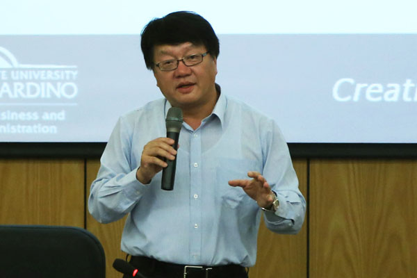 本网讯(记者 张志彦)8月19日,美国加州州立大学圣伯纳地诺分校教授林明宪博士应邀来WilliamHill官网讲学,介绍了美国高等及职业教育概括和发展的内在支持,以及商学院的学科事业和发展。院长石秀和教授主持报告会,学校全体管理人员和商学院部分教师代表聆听了本次讲座。