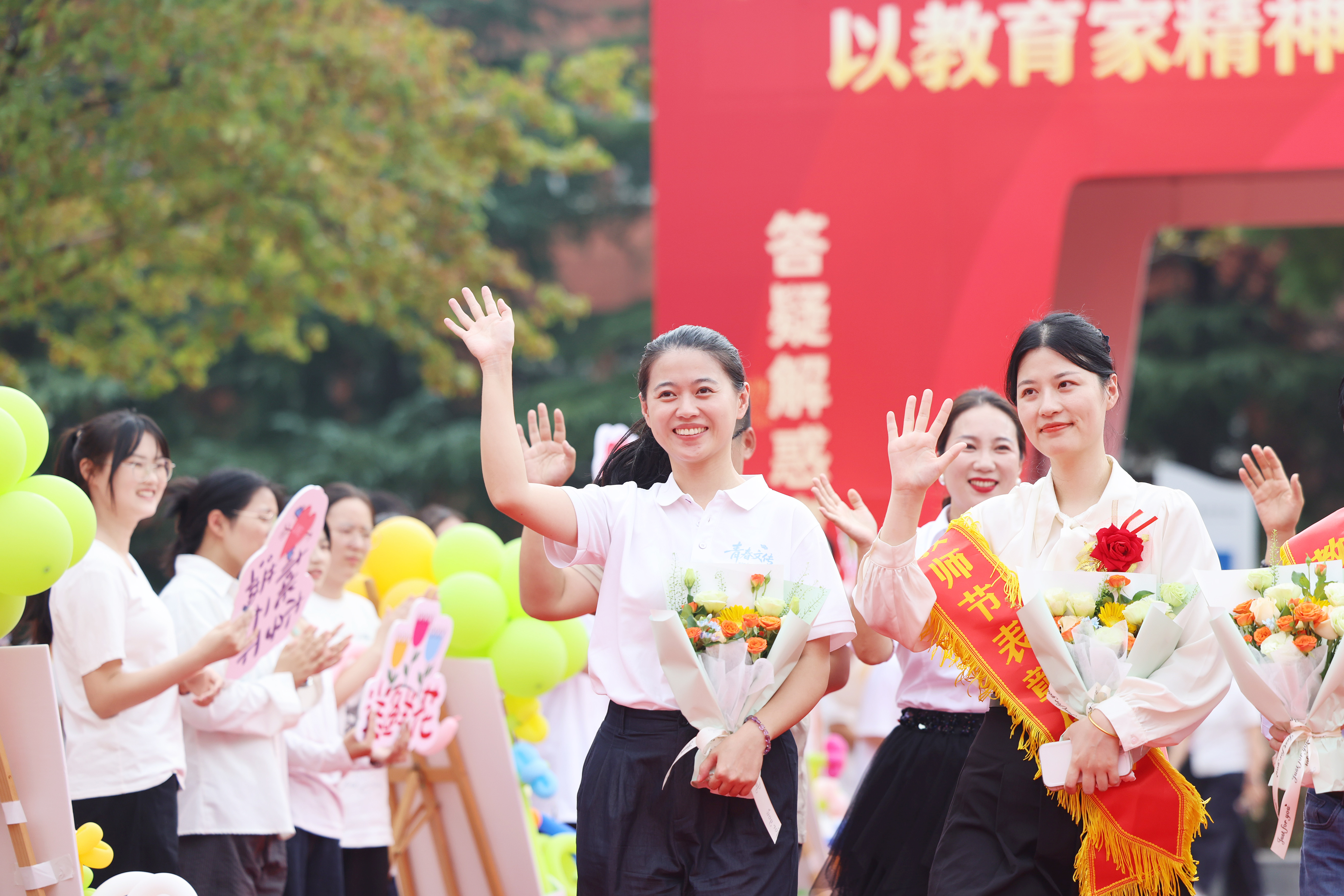 下午1点,蜀麓广场气氛热烈,红毯“走秀”环节拉开了表彰大会的序幕。受表彰的教师们迈着自信从容的步伐,在师生们热烈的掌声和欢呼声中走过红毯,在签名墙前签名留念。