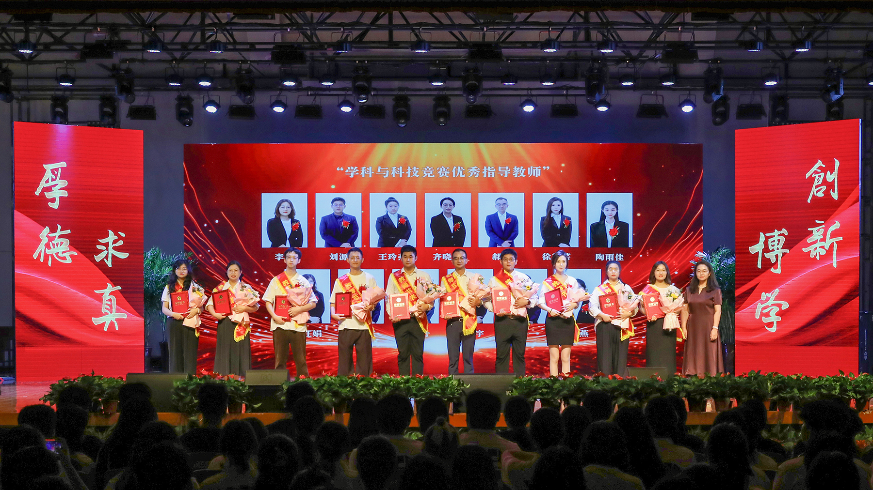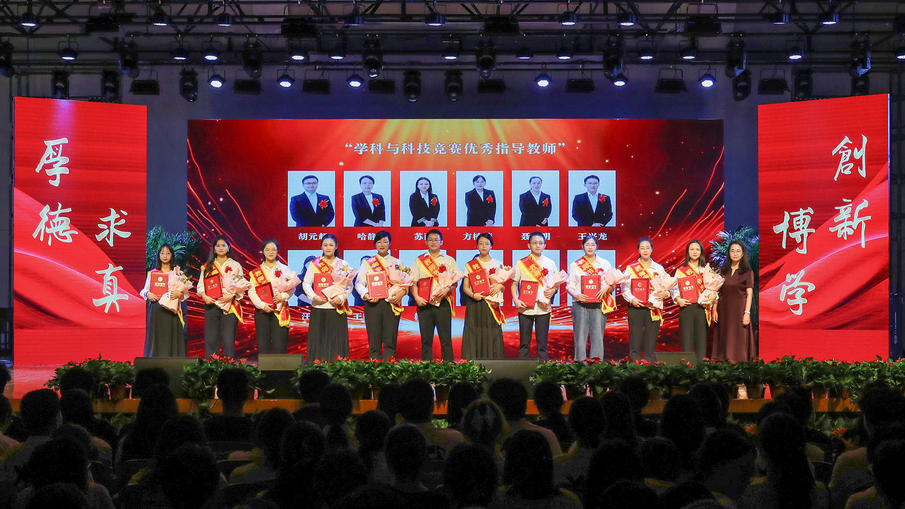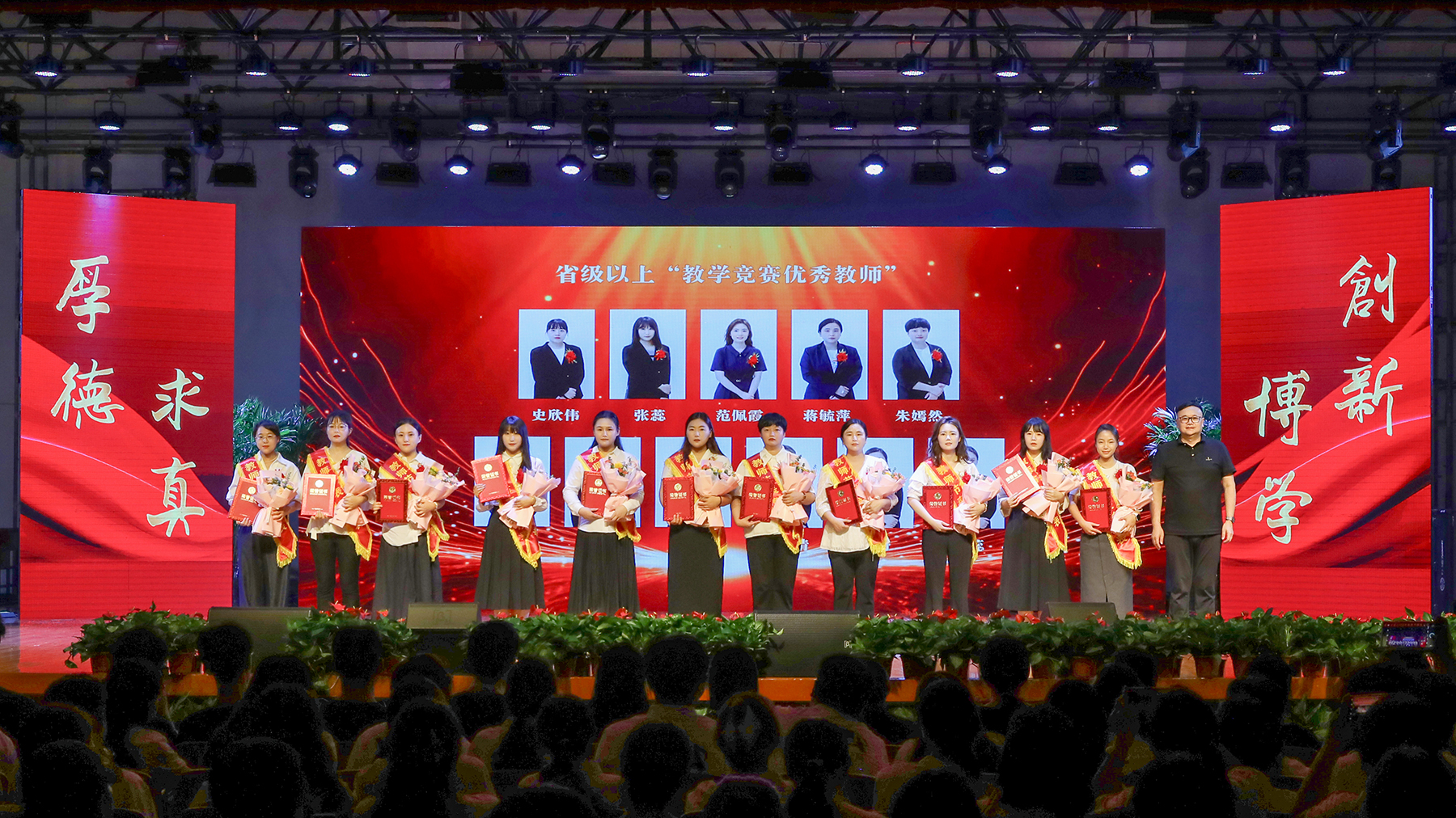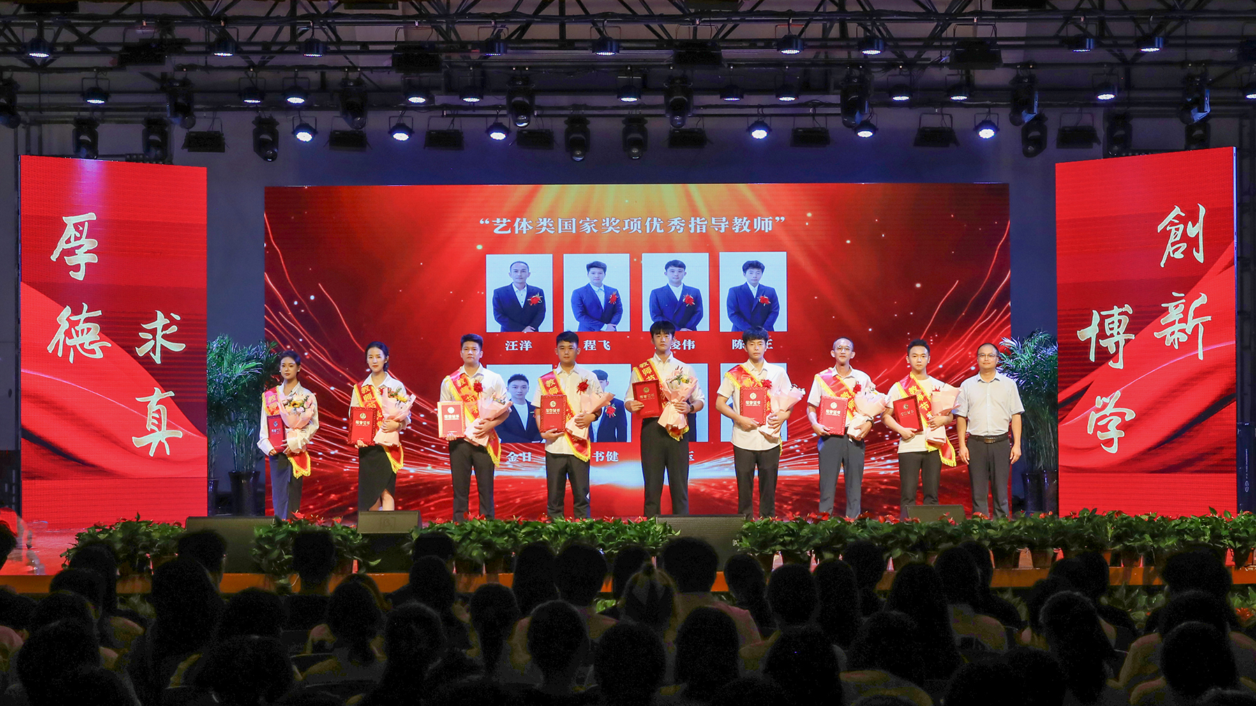 第一篇章聚焦教师在学科竞赛与艺体领域的引领作用,表彰在指导学生参与国家级赛事中屡创佳绩、为校争光的优秀教师。副校长盛晓青为“学科与科技竞赛优秀指导教师”颁奖;副校长王琦进、李军分别为两组“艺体类国家奖项优秀指导教师”颁奖。