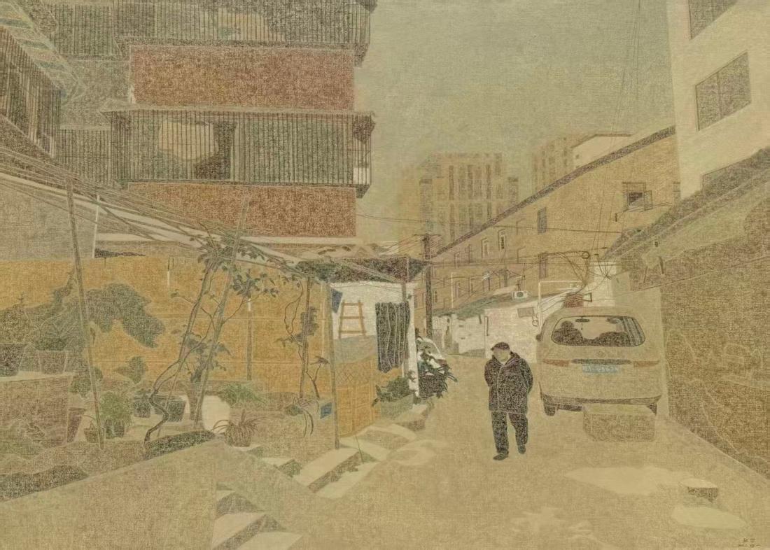 作品《小城故事系列五》以独特的艺术视角,通过一条纵深的小巷将观者视线引向新旧建筑交织的天际线,以斑驳墙面与错落盆栽的细腻刻画,在怀旧氛围与生活气息间达成微妙平衡,生动展现了城乡变迁中的人居记忆。而《小城故事·茶馆生活四》则以传统茶馆为题材,用精湛的油画语言,生动捕捉了市井生活中的宁静瞬间与人文温情,画面构图错落有致,笔触细腻而富有韵味,是对写意精神在当代油画创作中传承与创新的成功探索。