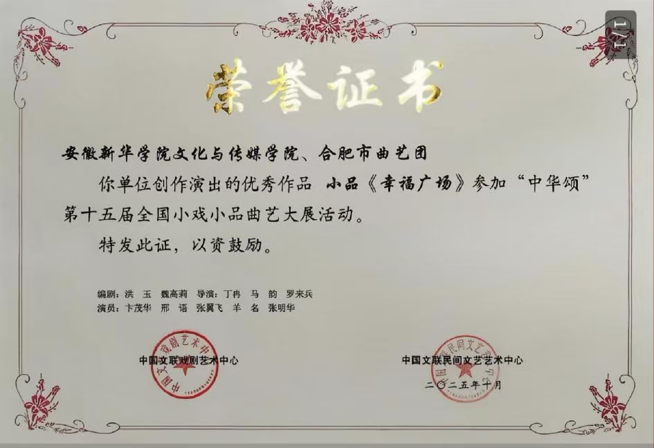 本网讯(通讯员:邢语)近日,WilliamHill官方网站文化与传媒学院选送的小品作品《幸福广场》在“中华颂”第十五届全国小戏小品曲艺大展中脱颖而出,获得广泛关注。该展作为全国性重要文艺平台,具有广泛影响力与权威性。