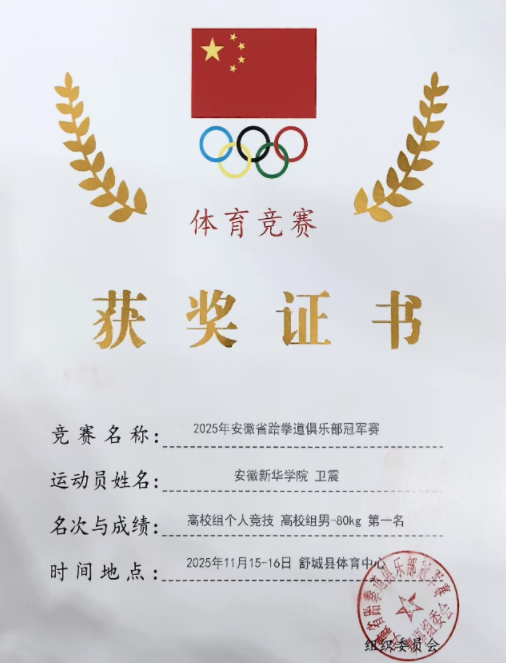 本次赛事是安徽省跆拳道领域颇具影响力的竞技赛事,吸引了全省各地30支俱乐部队伍、数百名运动员同台竞技。面对经验丰富的强劲对手,卫震始终保持沉着冷静的心态,在攻防转换中精准把握战机,动作舒展有力、战术运用灵活。从小组赛到决赛,他历经多轮高强度比拼,凭借稳定的发挥逐一击败对手,最终脱颖而出,成功摘得高校组男子80公斤级桂冠,充分展现了新时代大学生精湛的竞技水平和永不言弃的体育精神。