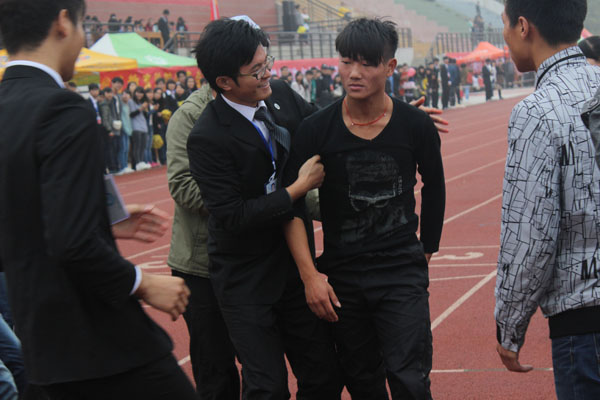 护校队队长周阳阳说,为做好此次运动会的护校工作,护校队分成了两组,一组在体育场进行现场秩序维持工作,一组在体育场外的校园各处巡逻,以防意外事件的发生。“不管是运动会还是其他活动,安全都是第一位的,所以我们护校队时刻都在准备着。”