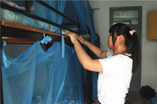 打开宿舍门,王静看到整齐的桌椅板凳、干净的床铺,特别是刚刚装好的新空调,开心地说:“又找到了住宿舍的感觉,真的很喜欢这种生活。”原来她初中和高中都是在学校住宿,她早就适应了宿舍的生活,这个自立的姑娘很快就收拾好了行李和物品,把桌椅板凳擦干净。