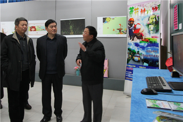 全国政协常委李卫华(左一)、李和平(左二)参观动漫学院作品展厅