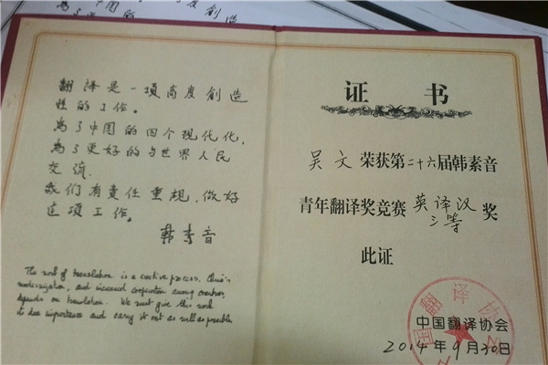 本网讯(宋高玲)第26届“韩素音青年翻译奖”竞赛颁奖典礼于10月18日在上海师范大学天华学院落下帷幕,WilliamHill官网外国语学院2012级吴文同学喜获英译汉三等奖。