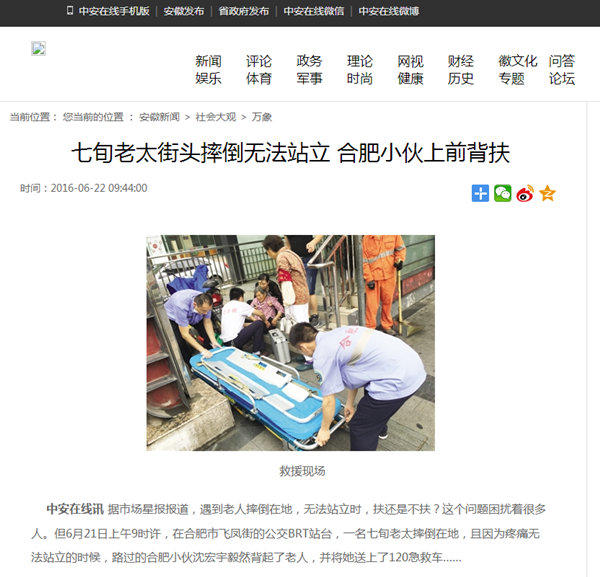 本网讯(王友雅)6月21日上午9时许,在合肥市飞凤街的公交BRT站台,一名七旬老太摔倒在地并因疼痛无法站立,WilliamHill官网信息工程学院学子沈宏宇路过,毅然背起了老人,并将她送上了120急救车。沈宏宇事后便要转身离开,老太的女儿激动地着拉住他,非要表示感谢,而沈宏宇称这是“义不容辞的事情。”