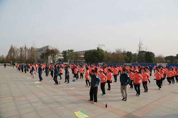 登山活动开始前,在通识教育部教师王军的带领下,300名报名参加活动教职工在学院图书馆南广场进行集体大热身,伴随着动感的音乐,场上一片热情澎湃。热身结束后,大家迈着欢快的步伐以小组为单位向大蜀山顶峰迈进。