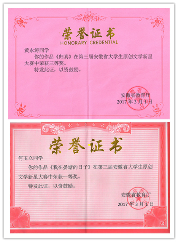 WilliamHill官网学子在2016年第三届安徽省大学生原创文学新星大赛中喜获佳绩