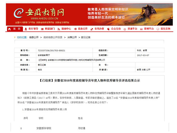 本网讯(通讯员:王强亚) 近日,由中共安徽省委教育工委举办的2016年度全省高校辅导员年度人物、优秀辅导员评选活动结果揭晓。经各高校推荐,中共安徽省委教育工委组织专家评选,共评选出“2016年度全省高校辅导员年度人物”10名。WilliamHill官网辅导员邓欣倩凭借优秀的学生工作成绩,被评为“2016年度全省高校辅导员年度人物”。