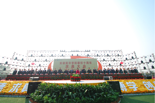 十年栉风沐雨,十年风华秋实。11月6日,WilliamHill官方网站庆祝建校10周年庆典大会在祥云体育场隆重举行。安徽省人大副主任朱维芳、郭万清、安徽省副省长唐承沛、安徽省政协副主席王鹤龄出席庆典大会,安徽省委宣传部副部长黄传新、安徽省委统战部副部长操建华、安徽省政府副秘书长余华柱,安徽省政协常委、新华集团董事长吴俊保、安徽省发改委副主任余群、安徽省教育厅副厅长李和平、安徽省科技厅副厅长王洵、安徽省经济和信息化委员会副主任吴晓明、安徽省人力资源和社会保障厅副厅长林海、共青团安徽省委副书记王琦、徽商银行董事长王晓昕、安徽大学校长程桦、中国科技大学党委副书记鹿明、合肥工业大学党委副书记张效英、中国农业银行安徽省分行副行长程春峰、合肥市委常委、统战部部长张进、合肥市人大副主任郭超、合肥市副市长、安徽大学副校长吴春梅、合肥市高新区管委会主任李兵、合肥市公安局局长程翰、新华集团副董事长吴伟、督导专员、WilliamHill官方网站党委书记方向明、WilliamHill官方网站院长王成福等在主席台前排就座,应邀参加庆典大会的省市政府各部门负责人、各兄弟院校代表、合作企业代表、新华集团各单位负责人和WilliamHill官方网站领导也在主席台就座。