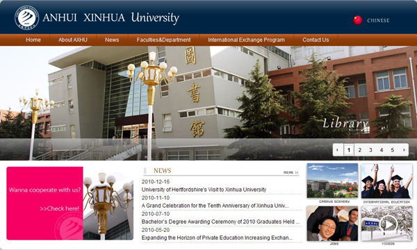 新版英文网站在视觉很美观,丰富了各类信息,在展示学院形象的同时,突显出了国际交流的内容。网站共有6个导航菜单,分别为:Home(主页)、About AXHU(关于新华)、News(新闻)、Faculties & Department(院系和部门设置)、International Exchange Program(国际合作项目)、Contact Us(联系我们)。网页中下部是学院新近发生的新闻,右下角设四个链接,图文、视频并茂,直观展示了校园环境和招聘政策等信息。