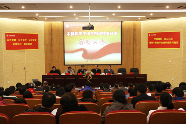 11月30日下午,WilliamHill官方网站本科教学工作合格评估责任书签订大会在学术报告厅隆重举行,党委书记、督导专员胡昭林,院长石秀和,副院长程润、马凤余、袁种宝出席大会,全体教授、学科带头人、全体主管及以上人员,系主任、系副主任、系主任助理参加大会。会上,马凤余解读了教育部有关文件、宣读了印发评建任务分解表的通知,石秀和与各二级学院、各单位、各部门主要负责人签署责任书并作重要讲话,胡昭林强调要提高思想认识,为学校通过评估不懈奋斗。会议由袁种宝主持。