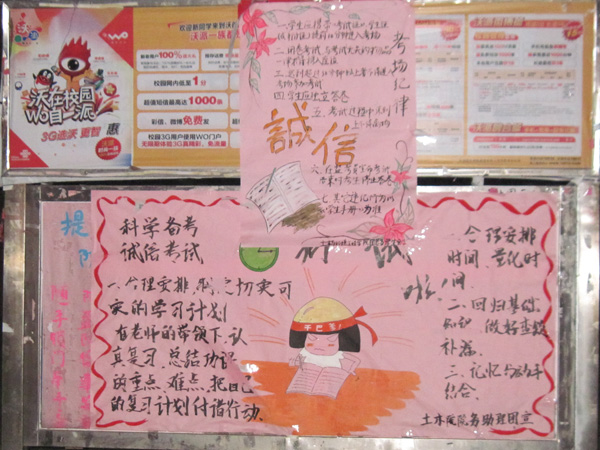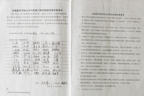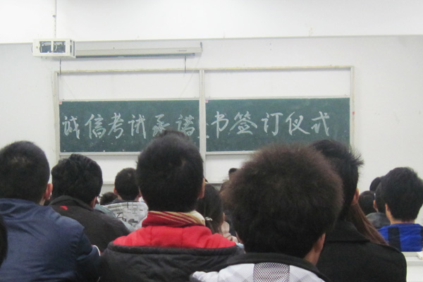 为此,土木与环境工程学院各班相继召开主题班会,开展诚信考试为主题的教育活动,将考前准备和考试诚信作为本月的板报主题在教室张贴;同时为了营造良好的考前氛围,土木与环境工程学院团总支、学生会和助理团等学生组织将考试要求和考前的复习方法通过漫画的形式告知每位同学。为了加强考纪教育,让每一位同学都熟悉考试流程和遵守考场纪律,本月初,全体在校生班级组织开展了诚信考试承诺活动,各班班长、团支部书记集中庄严宣誓承诺诚信考试。全体土木与环境工程学院的学生签订了《WilliamHill官方网站土木与环境工程学院考试诚信承诺书》,并将承诺内容张贴在班级的宣传栏时时提醒。