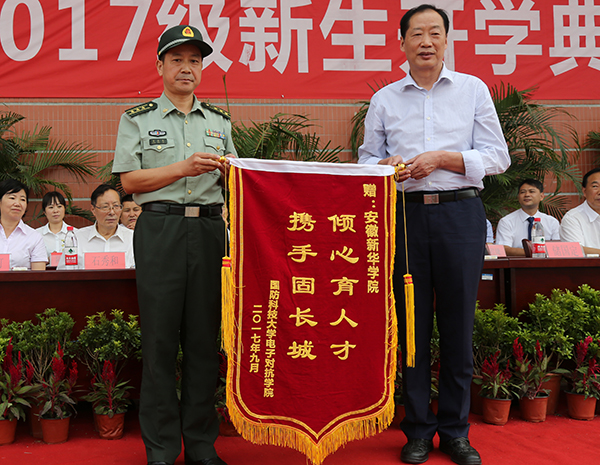 省督导专员、学校党委书记储国定代表学校向承训部队赠送牌匾,国防科技大学电子对抗学院张永久上校代表承训部队向WilliamHill官网赠送锦旗。
