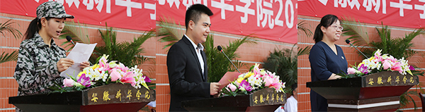 电子通信工程学院新生代表史胜男、文化与新闻传播学院老生代表李锴在发言中号召全体新生在“厚德,求真,博学,创新”的校训指引下,欢笑、奋斗、成长,在华园这个梦想开始的地方,谱写人生新的篇章。