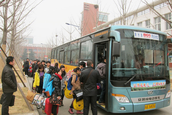 1月8、9、10日三天,数辆801路公交车缓缓驶入校园,早已排队等候的学生有序登上公交车,公交车很快就坐满了学生,快速驶往汽车站和火车站。