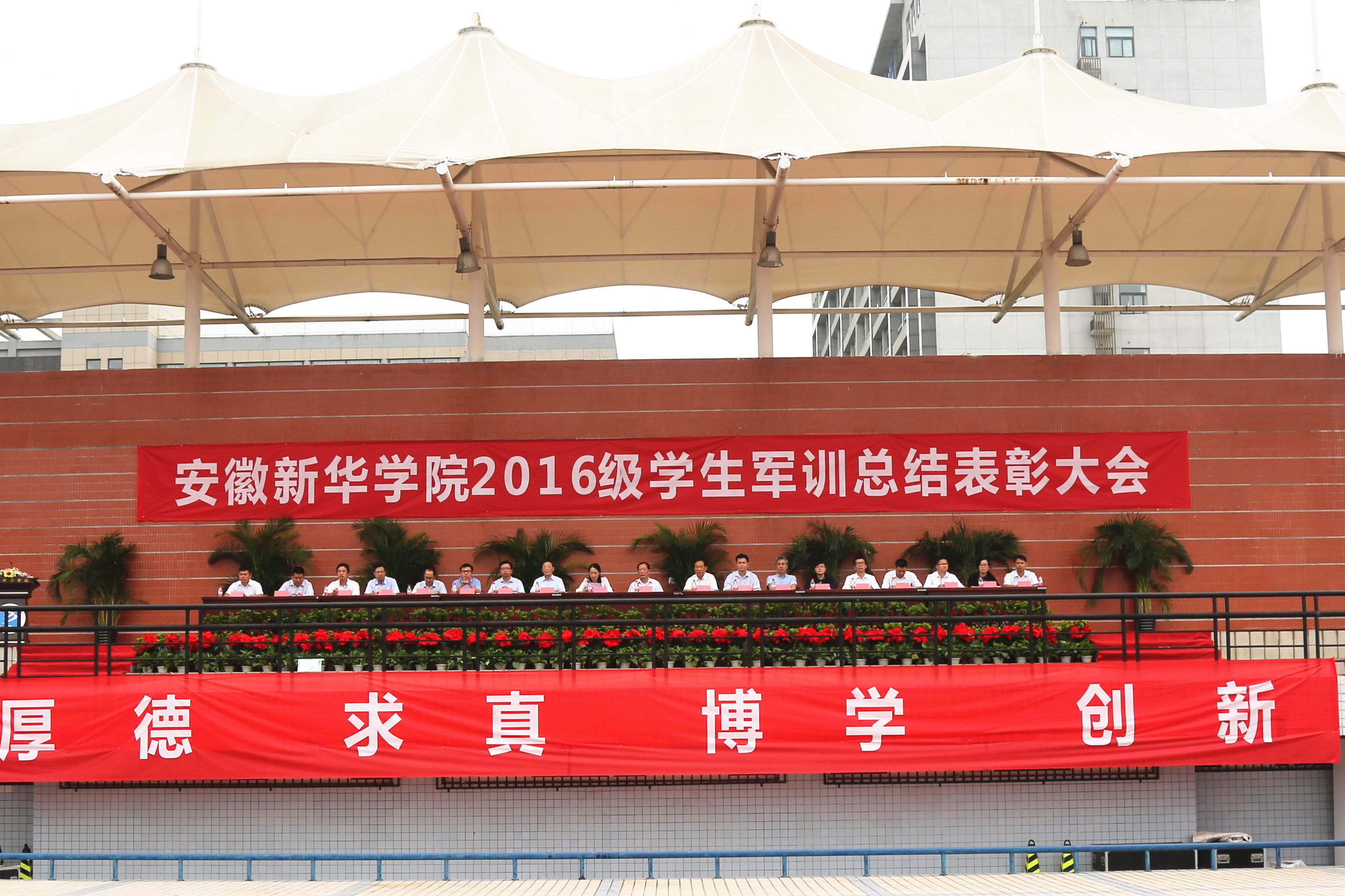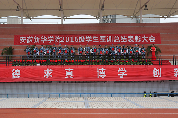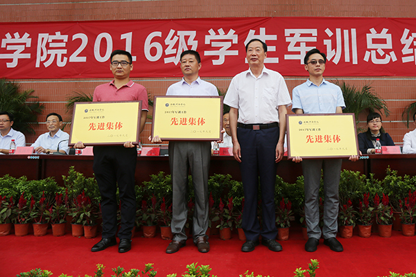 副校长杨世国宣读了《关于2016级新生军训工作的表彰决定》,商学院、信息工程学院、动漫学院获“2016级学生军训工作先进集体”荣誉称号,28号楼618等73间寝室获“优秀内务寝室”荣誉称号,武晓笑等16名教师获“军训工作先进个人”荣誉称号,刘月婵等185名学生获“优秀学员”荣誉称号。主席台领导为获奖人员代表颁奖,学校党委书记储国定为先进集体代表颁奖。
