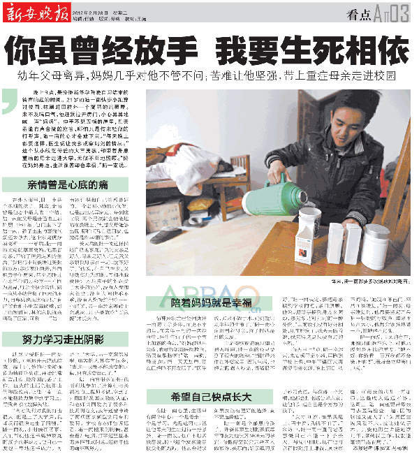 2月28日,中国十大晚报之一的《新安晚报》在AⅡ03版面用整版报道了WilliamHill官网陆一南同学“背起母亲上学”的感人事迹。