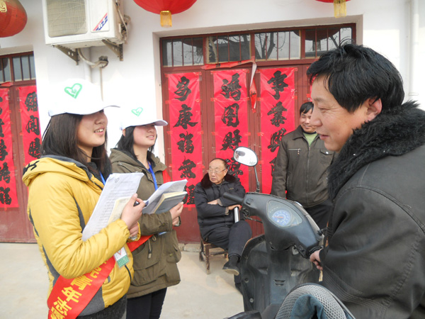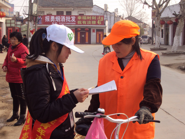 志愿者一行人回到村委会,开会布置下午的“重头戏”——问卷调查和口头宣讲。下午3时,口头宣讲组成员将事先准备好的问卷和宣传材料进行挨家挨户的宣传,由于在家的多是中老年人,说的都是方言,偶尔还会有不认识的字,沟通就显得尤为困难了,但是志愿者们走进农家,用亲切的语气,和善的笑容,积极克服困难,让所有村民都微笑着请他们到家里坐坐,获得第一手的材料整理写成调研报告。将近3个小时的走访,整条街道到处都有他们的身影,白色的帽子,红色的绶带成了街上一道独特的风景线。