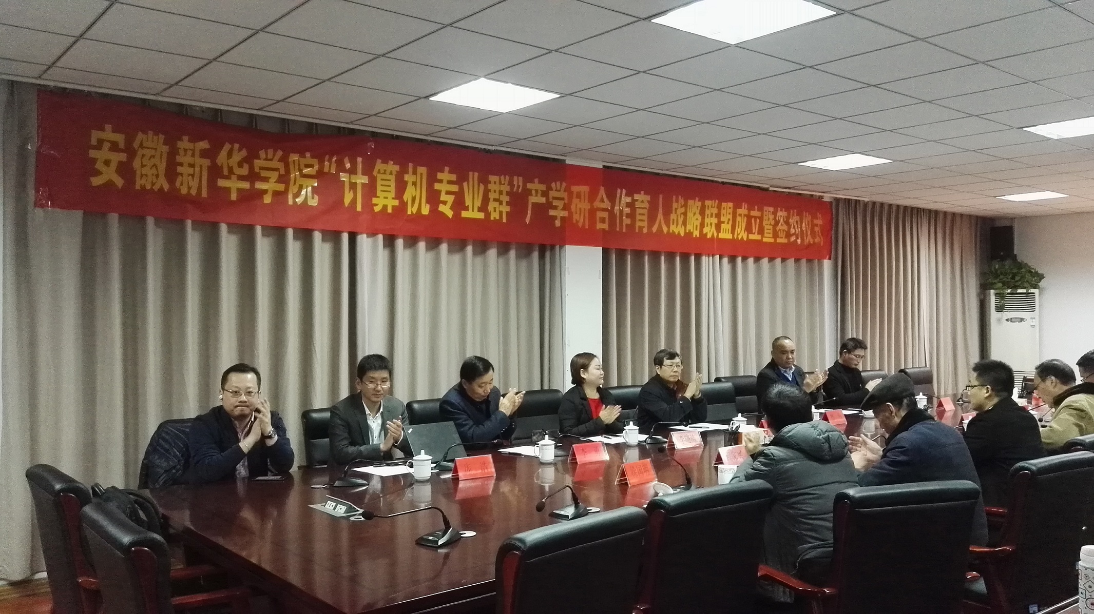 本网讯(通讯员:聂欢欢)12月20日,WilliamHill官网“计算机专业群”产学研合作育人战略联盟成立暨签约仪式在第一会议室顺利举行。校长石秀和、中国科技大学教授及安徽计算机学会秘书长徐云、合肥学院计算机系系主任檀明、合肥城市云数据有限公司常务副总经理李晓洁、华信智原安徽分公司总经理李勇、中软国际有限公司安徽分公司经理韦东成、联想安徽分公司经理庞浩、翡翠集团安徽分公司经理吴涛、科研处副处长王琦进、信息工程学院全体管理人员以及部分教师代表参加了仪式。会议由执行院长贺行佳主持。