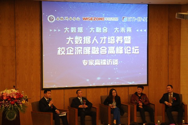 副校长朱兆健主持专家高端访谈,各位专家就大数据人才培养和校企合作等问题进行了深入讨论,希望深入校企培三方合作,携手共进,为安徽省大数据发展贡献力量。