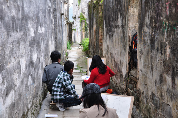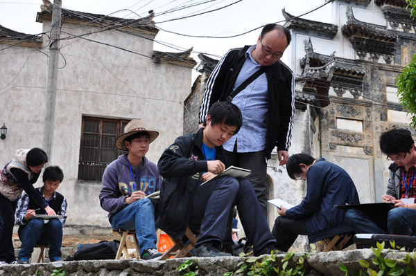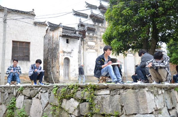 写生过程中,几位带队老师以高度的责任心完成此次校外教学。白天,他们现场示范和指导学生写生,晚上还对学生的作品进行讲评,帮助学生及时改进写生技巧。学生也非常珍惜这次户外写生的机会。白天,他们行走于古镇小巷,用手中的画笔记录着被徽州文化所熏染的恬静心境以及那些石礅桥、马头墙、飞挂的檐角和浓郁的乡风民俗;晚上,在一片宁静与温馨中认真地听老师点评习作。他们每天日出而作、日落而归,让自己的写生生活过得充实而又有蕴含诗意。