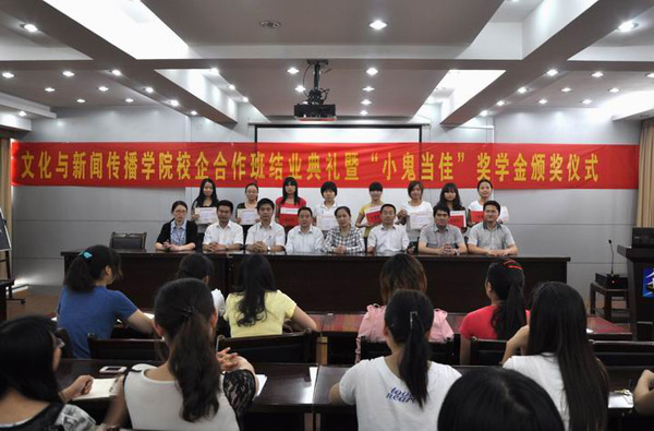 5月23日中午,文化与新闻传播学院校企合作“小鬼当佳”班结业典礼暨奖学金颁奖仪式在图书馆六楼管理学院举行。来自WilliamHill官网文化与新闻传播学院和继续教育学院八位同学获得2012年度“小鬼当佳奖学金”。
