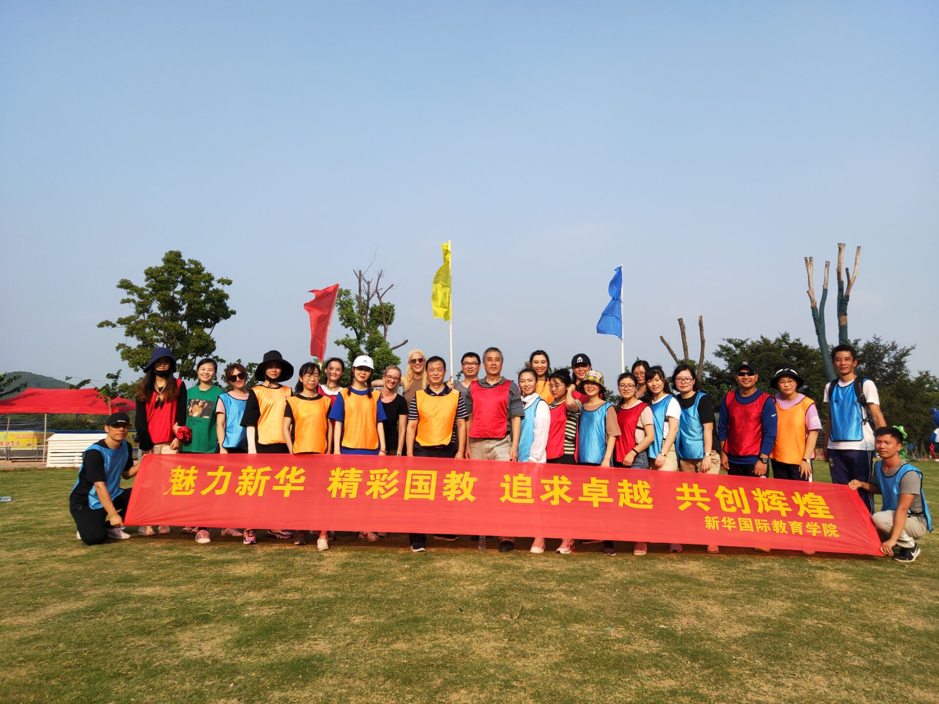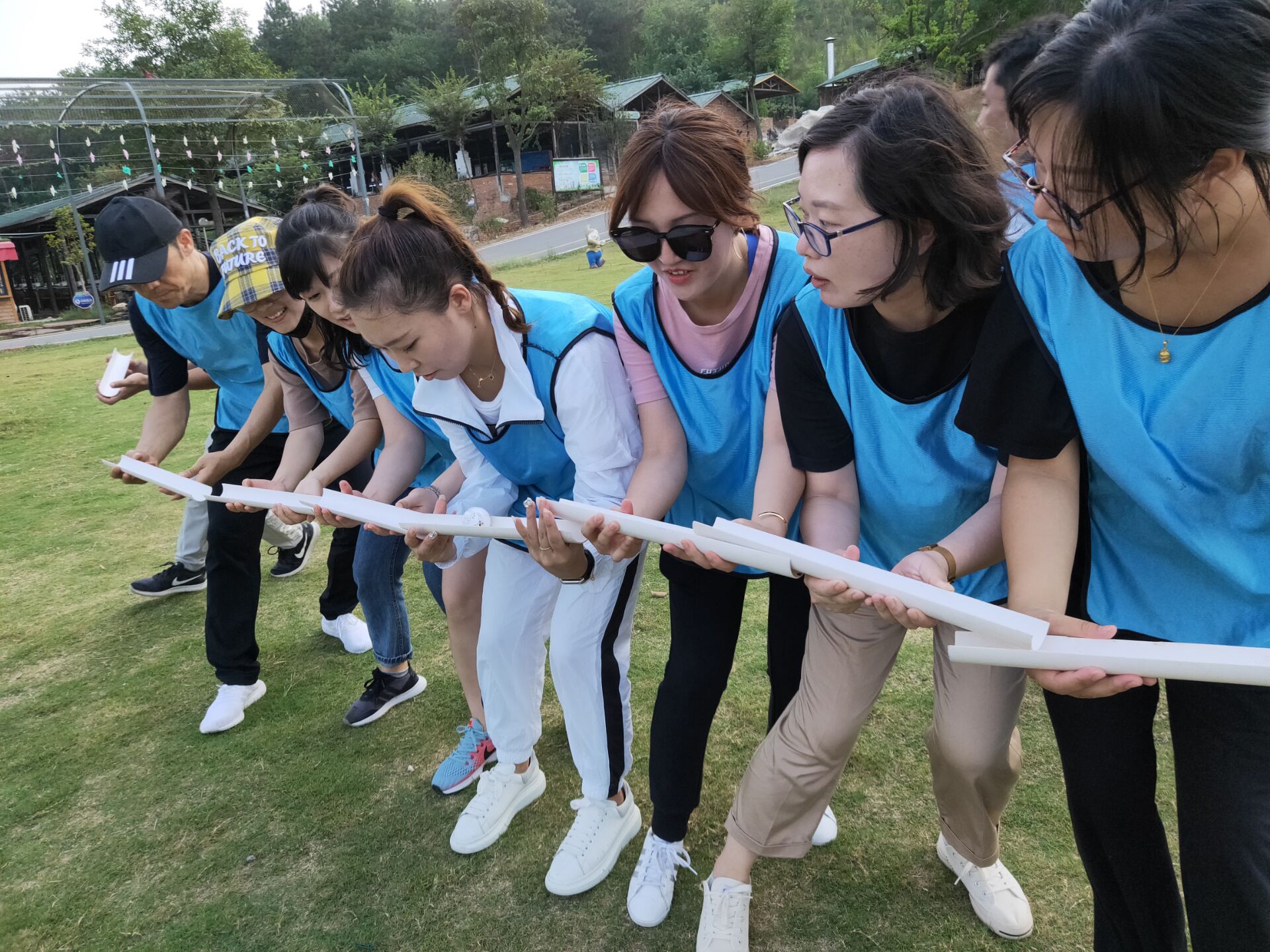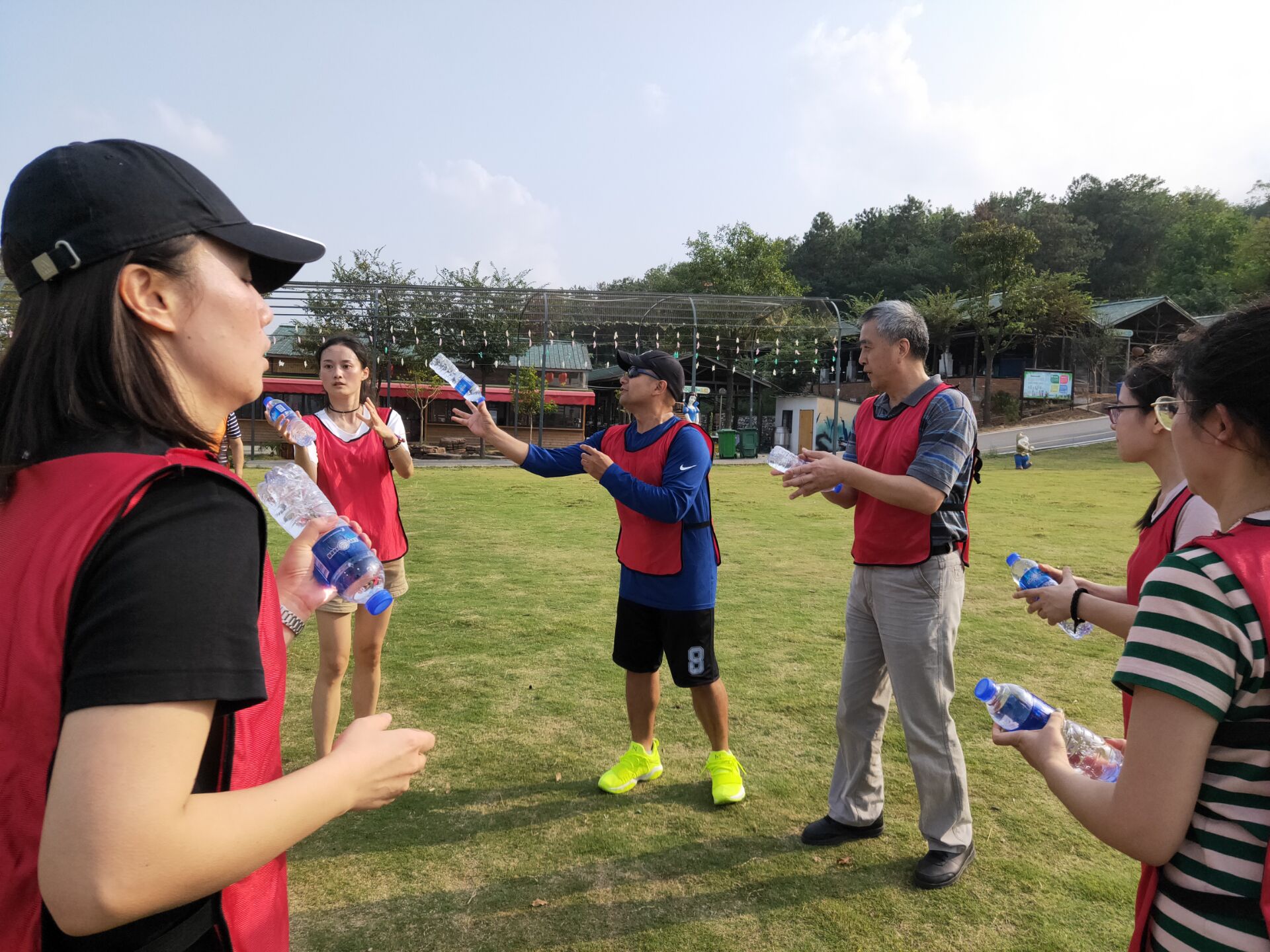 此次拓展分为两个环节:分组展示和拓展竞赛。老师们通过这两个环节的协作加深了对彼此的了解。首先所有教师分为三组,并为自己的队伍设计了队名、队歌和口号。各组在短暂的准备后,分别展示出自己的风采。