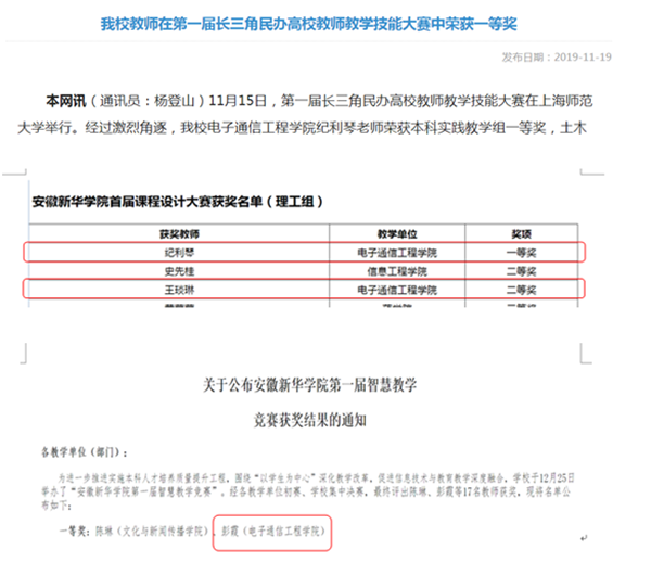 本网讯(通讯员:李文谨)2019年,电子通信工程学院教师在一系列省校级教学比赛中喜报频传。第一届长三角民办高校教师教学技能大赛纪利琴荣获一等奖;安徽省第二届移动教学大赛苏巧平老师荣获二等奖;第三届中国高等学校电工学青年教师“RIGOL杯”讲课竞赛申小芳、王琰琳老师荣获安徽赛区一等奖;WilliamHill官方网站首届课程设计大赛纪利琴、王琰琳老师分别获得理工组一、二等奖;WilliamHill官方网站首届“智慧课堂”比赛彭霞老师荣获一等奖等。