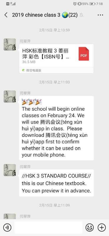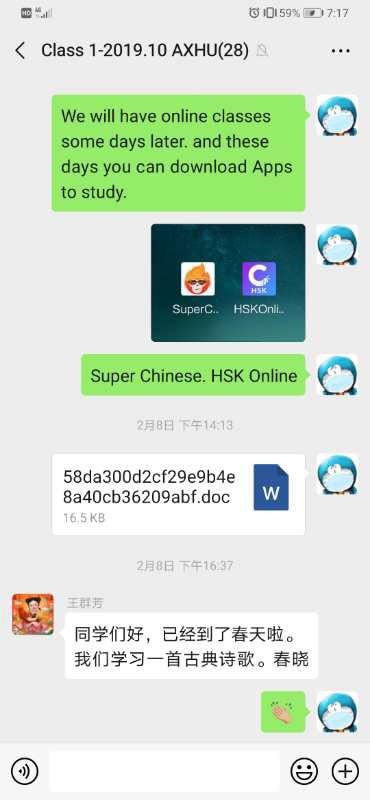 为确保教学质量,国际教育学院组织对外汉语教研室及全体留学生课程专兼职教师迅速完成线上及自学课程的教学材料准备,开展网络集体备课、研讨、教学材料互查等活动,同时建立留学生班级微信群,及时在群里发布学习任务和学习材料,确保师生沟通顺畅。
