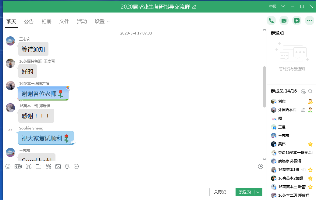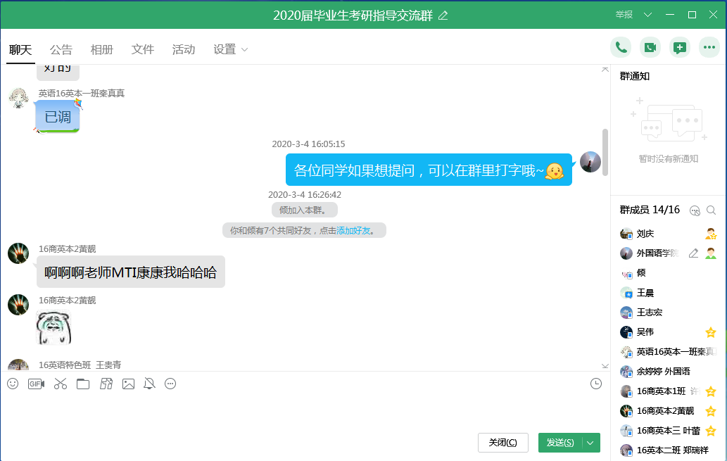 考研毕业生们针对目前存在的问题和复试的盲区,都在会议群中积极提问,各位老师都进行了解答,并将相关指导材料发给了大家。