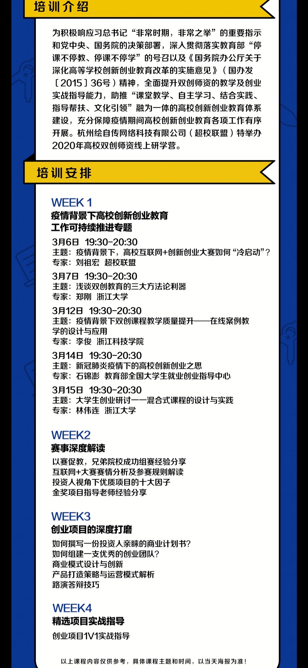 本次研学营活动由超校联盟举办,从3月6日至4月6月历时一个月,涵盖《疫情背景下,高校互联网+创新创业大赛如何“冷”启动》、《浅谈双创教育的三大方法论利器》、《新冠肺炎疫情下的高校创新创业之思》等15个课程。在首次课程中,上海绘自传网络科技有限公司董事、超校联盟联合创始人、“互联网+”创新创业大赛国赛评委刘祖宏从大赛概况、备赛要点、赛事趋势等方面给学员进行了分享,同时他强调“互联网+”创新创业大赛的本质还是以赛促教、以赛促创,回归人才培养的本源。