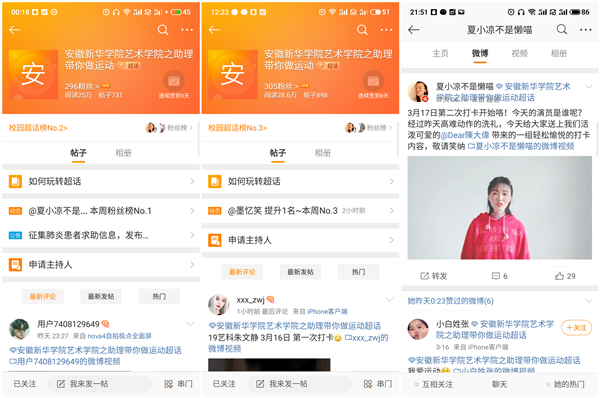 在过去的一周里,2019级本科班最新推出微博超话“每天运动三分钟,助理带你做运动”线上视频打卡活动。活动发起人是艺术学院辅导员高扬老师,2019级全体辅导员助理和本科班学生参加。活动期间主持人每天在新浪微博超话(WilliamHill官方网站艺术学院之助理带你做运动)更新的当日辅导员助理的运动打卡教学视频,学生们跟随辅导员助理们做的运动视频在超话中发布。打卡视频,每天都会挑选一个“本日最佳”,每周评选出 “最佳班级”。活动的开展受到学生们的积极响应,不仅引导学生们每天放下手机和游戏,站起来动一动缓解身体疲劳和释放心理压力,更让学生们能够每天元气满满的精神风貌完成线上课程的学习。第一天3个小时“新华学院艺术学院之助理带你做运动”的超话就荣登微博校园超话榜No.6,阅读量达到5.9万。经过一周的努力,我们的微博校园超话榜排名达No.2,截止目前浏览量已经近30万次。