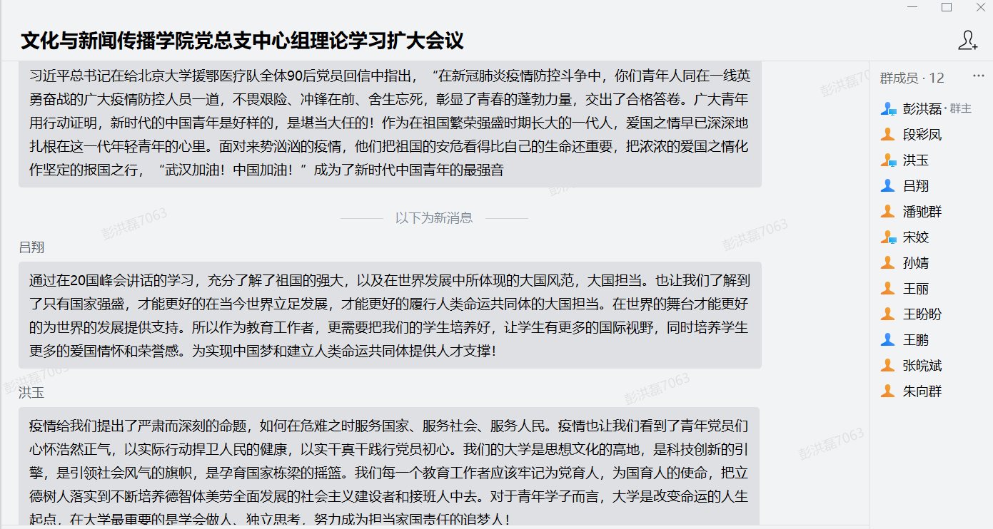 教师第一党支部书记王鹏深有感触:“总书记在二十国集团领导人特别峰会上的重要讲话,包含了我们党和人民的巨大努力,体现了我们以人为本的民族情怀和众志成城的团结精神,显示出无坚不摧的民族凝聚力和巨大的制度优越性;疫情是灾难,是苦难,也是磨刀石,磨砺了中华民族的精神和品格。疫情之后的中国更加强大,人民更加团结,在世界面前展现了强起来的大国力量和姿态,让我们看到了中华民族伟大复兴的希望。”