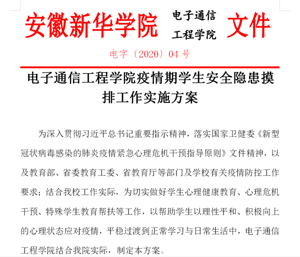 本网讯(通讯员:杨宏) 新型冠状病毒感染的肺炎疫情防控形势严峻复杂。为贯彻落实习近平总书记关于坚决打赢疫情防控阻击战的重要讲话和指示批示精神,落实省委、省政府和教育部部署,根据省委教育工委、省教育厅关于做好新型冠状病毒感染的肺炎疫情防控期间线上开学通知精神,电子通信工程学院按照学校指示,依据《安徽省高等学校新型冠状病毒感染的肺炎疫情防控期间线上开学工作指南》和《WilliamHill官方网站新冠肺炎疫情防控期间线上开学工作方案》,特对疫情防控期间全体师生持续进行安全隐患排查。