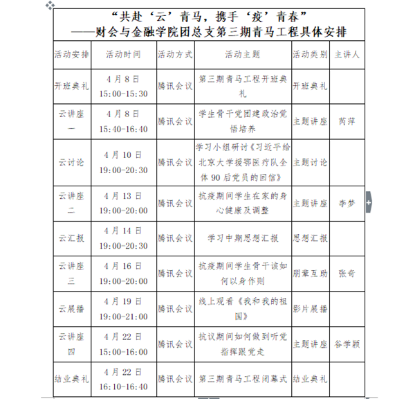 本期青马工程在防疫特殊时期背景下,在延续以往传统教学的基础上,进行了课程、实践、方式的创新,在财会与金融学院全体师生的全力配合与支持下,首次尝试“云青马”模式,通过“云讲座”、“云讨论”、“云汇报”、“云展播”四种形式,以政治理论学习、思想引领、实操指导、心理辅导、朋辈互助为培养内容,着眼需求以引领青年、强化理论以武装青年、以优带优以塑造青年、创新模式以活跃青年、整合资源以服务青年,促使青年树立远大理想,热爱伟大祖国,担当时代责任,勇于砥砺奋斗,练就过硬本领,锤炼品德修为,在特殊时期引领青年学生坚定跟党走中国特色社会主义道路的信念,更好地成长为中国特色社会主义事业的合格建设者和可靠接班人。