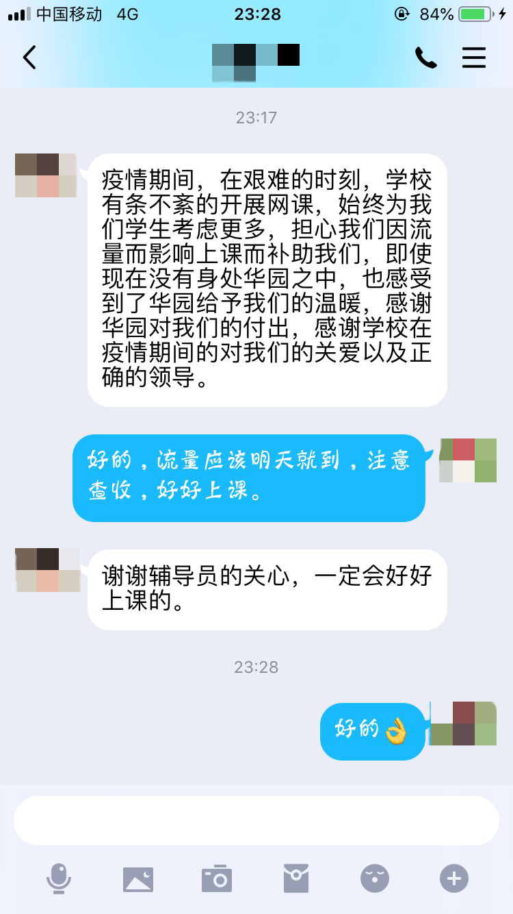 收到手机流量包后,文化与新闻传播学院2018级汉语言文学1班黄同学表示,这一举措让他们亲切感受到了学校的人文关怀和浓浓情意,他们一定会严格按照学校“停课不停学”的要求,服从学校统一安排部署,认真参加线上学习活动。为打赢疫情防控阻击战贡献自己的力量。