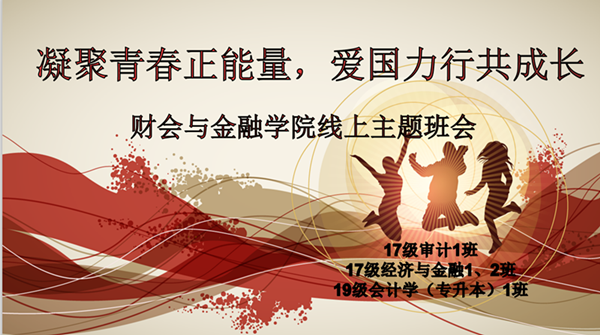 本月主题班会云观摩活动的顺利开展,有助于财会与金融学院深化“三全育人”综合改革,有利于构建加强和改进思想政治教育、开展爱国主义教育的长效机制,完善立德树人体制。财会与金融学院以教育引导师生“爱国、奋斗”,将抗击疫情伟大实践作为爱国主义教育的宝贵资源,切实引导师生增强中国特色社会主义道路自信、理论自信、制度自信、文化自信,厚植爱国主义情怀,把爱国情、强国志、报国行自觉融入实现国家富强、民族振兴、人民幸福的伟大梦想之中,用实际行动书写自己的青春,用青年一代的责任和担当为祖国的繁荣发展贡献力量!