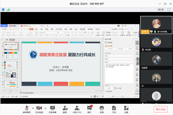 4月18日,辅导员谷学颖借助“腾讯会议”平台,通过“众志成城共防疫”、“坚定自信我先行”、“国家安全靠大家”、“求职升学正当时”四个部分开展班会。她通过分享抗疫英雄的事迹,讲述在中国共产党的领导下,全国人民在面临重大困难时的强大凝聚力和战斗力,引导学生们要树立战胜疫情的信念,努力做一个有责任、有担当的人。班会过程中设置提问分享的环节,让学生们对于主题班会发表自我见解与体会感悟,班会氛围活跃,极大提高了学生的参与度与积极性。