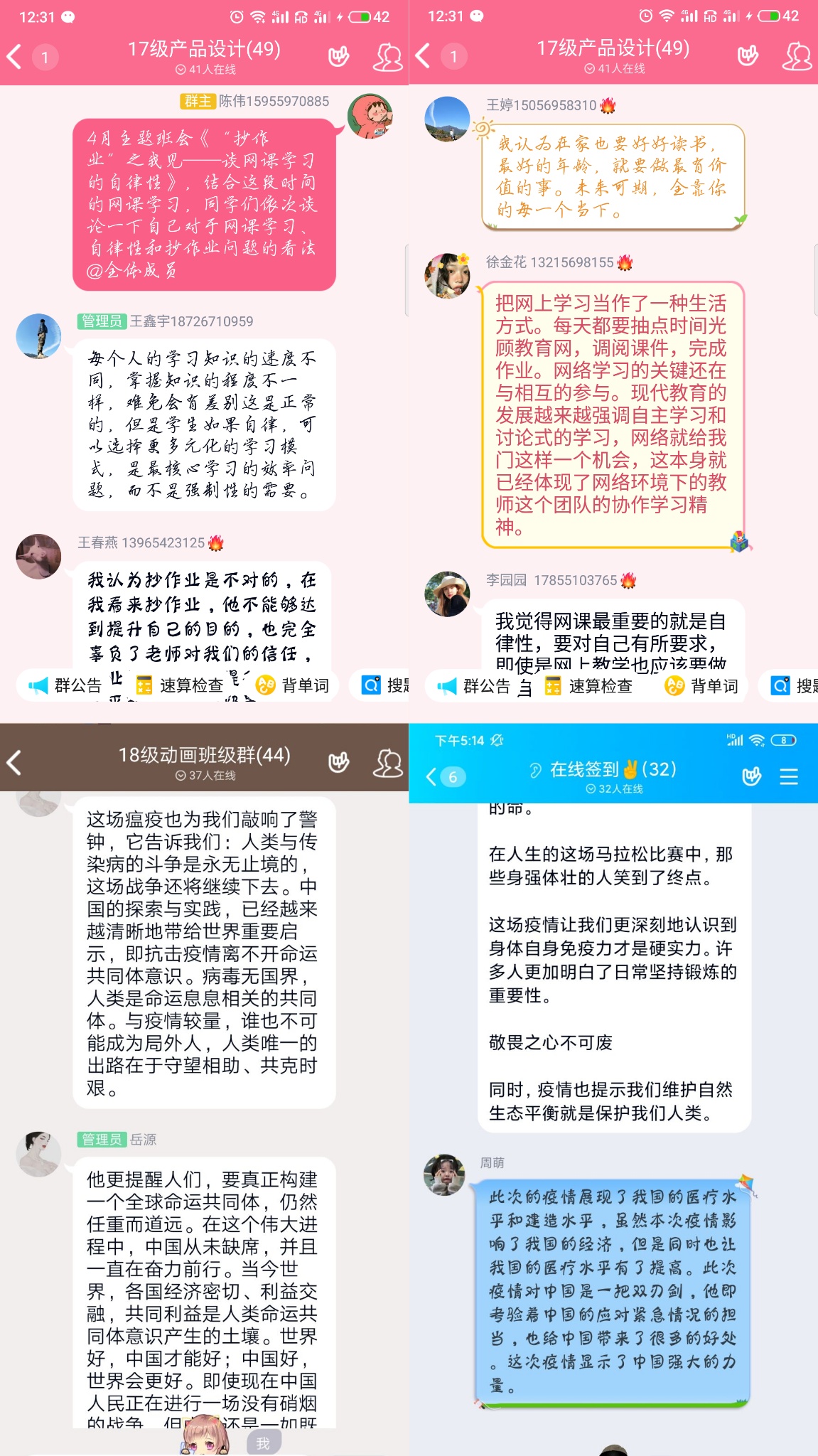 各班级团支部积极筹划,创新开展,将“思想引领”落到实处,各班级团支部通过组织专题学习、专题讨论、影像资料观看、心得分享等形式开展,活动内容详实丰富,其中17级视觉传达1班对于《疫情也是大考——谈中国力量》主题进行了深入讨论,学生们表示,在“中国答卷”中他们看到了党对人民的责任和担当,真正做到了以人民为中心;看到了中国共产党和社会主义制度的显著优势,是可以使中华民族真正复兴的伟大道路。在活动结束后,各班级团支部书记积极主动的将学习效果与成果汇报给团总支,进一步彰显了团组织的凝聚力与号召力。