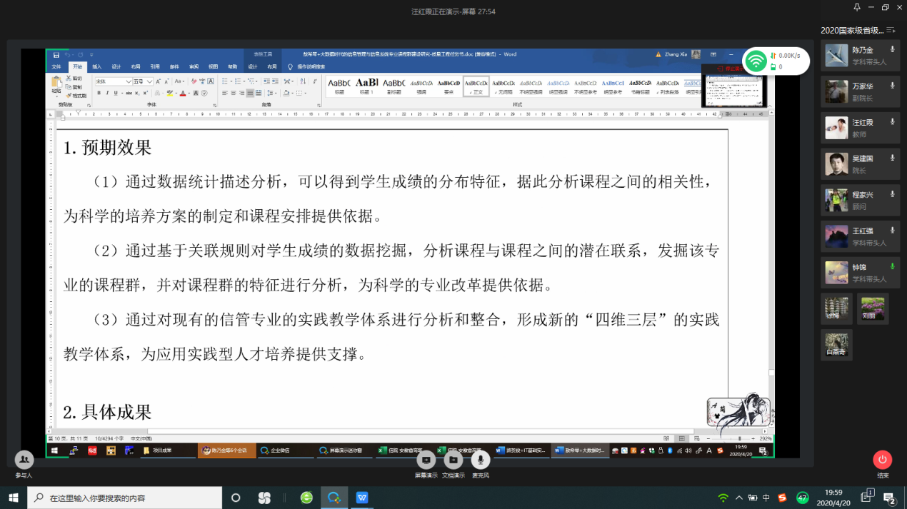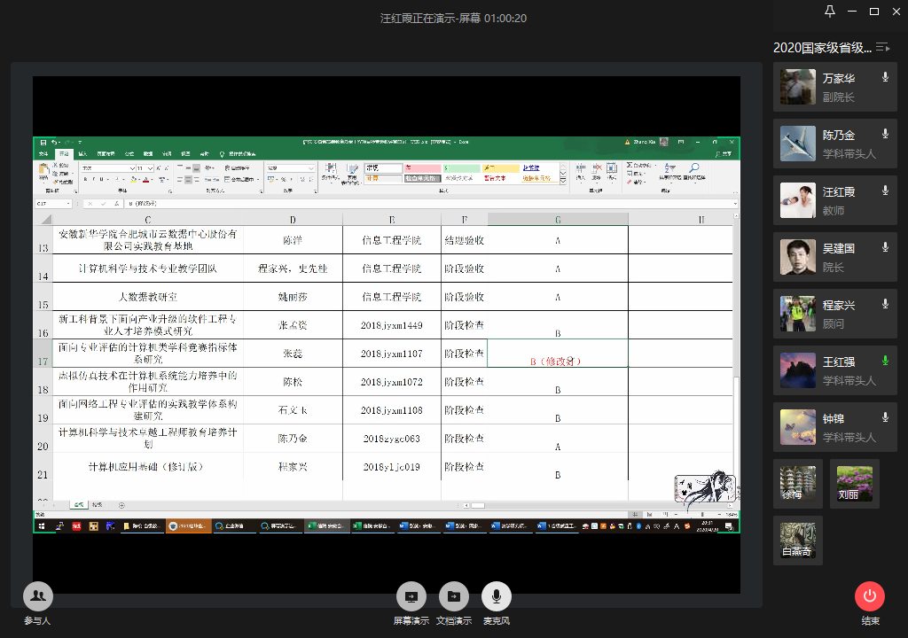 本网讯(通讯员: 汪红霞)根据WilliamHill官方网站《关于开展国家级、省级、校级“质量工程”项目年度检查验收工作的通知》文件要求,为进一步加强省校级各类“质量工程”项目建设与管理,更好地推进各项目的顺利实施,提高各项目检查验收的质量,4月20日,信息工程学院通过企业微信平台召开2020年“质量工程”项目检查验收评审会,中国科学院合肥智能机械研究所王红强教授、安徽工程大学陈乃金教授、合肥师范学院钟锦教授,信息工程学院顾问程家兴教授等9名校内外高级职称专家组成评审组。会议由吴建国主持。