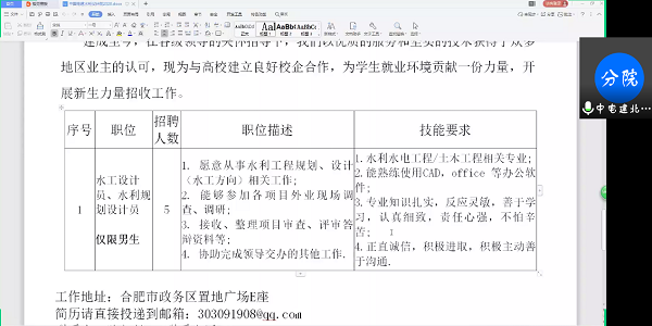 中国电建北京勘测设计研究院有限公司安徽分公司是大型综合性勘测设计研究单位。由北京总院高级工程师段大琪担任分院院长。建成至今,以优质的服务和坚实的技术获得了众多地区业主的认可。现为与高校建立良好校企合作,为学生就业环境贡献一份力量,开展此次招聘。人力资源部陈部长向学生系统介绍公司发展历程、业务领域、人员需求、福利待遇以及人才培养等。在线上互动时,不仅为学生解答疑问,还鼓励学生大胆向前走,积极投递简历。
