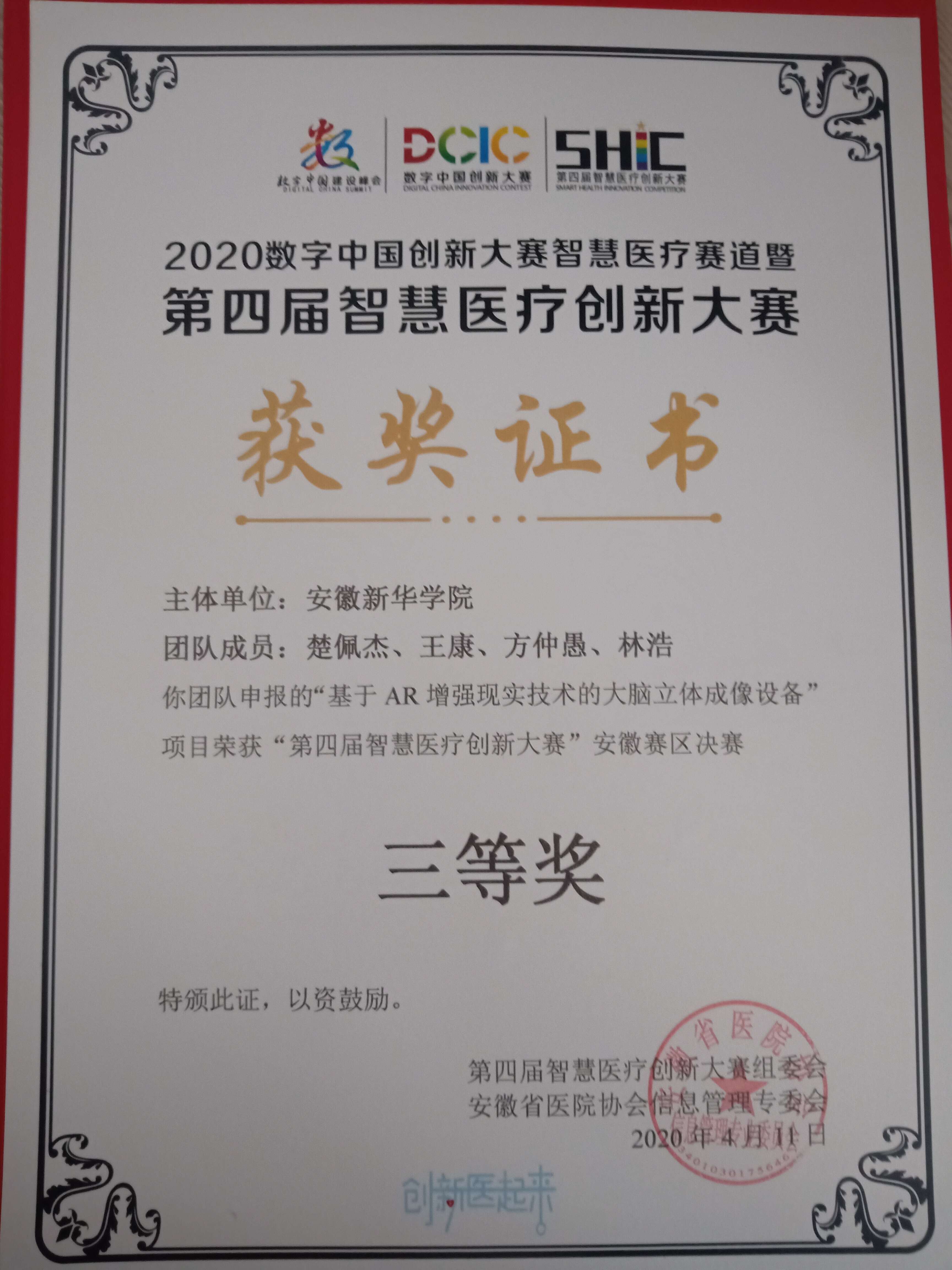 本网讯(通讯员:苏丽)近日,2020数字中国创新大赛智慧医疗赛道暨第四届智慧医疗创新大赛举行。WilliamHill官网信息工程学院苏丽老师指导的楚佩杰、王康、方仲愚、林浩同学“基于AR增强现实技术的大脑立体成像设备”项目获得安徽赛区决赛三等奖。