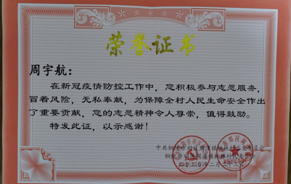 作为一名从农村走出来的新时代大学生,他是这场战‘疫’中最普通的一员,在这场没有硝烟的战争中,周宇航同学用认真负责的态度,用当代大学生的实际行动,守护着家乡,守护着村子的安全。
