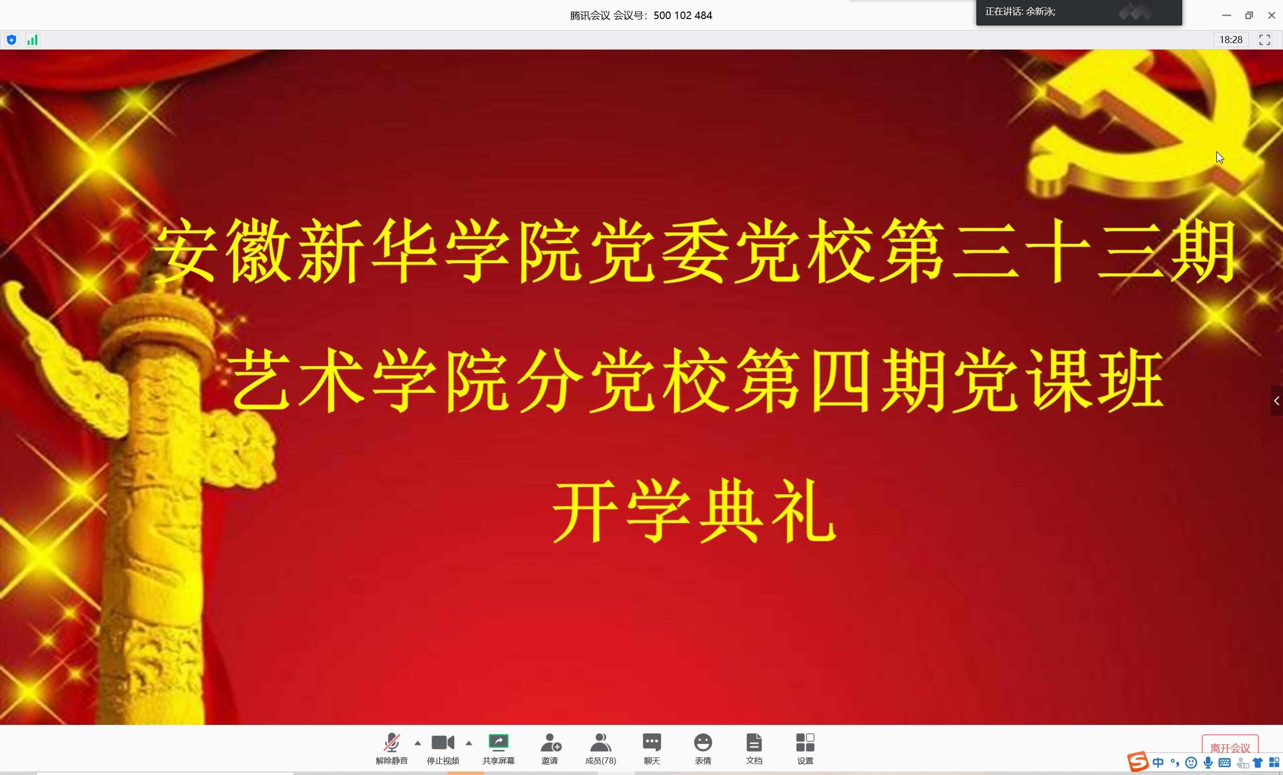 本网讯(通讯员:高扬)为加强对入党积极分子的培训,做好艺术学院党员发展工作,WilliamHill官方网站第三十三期艺术学院分党校第四期开班典礼于2020年5月7日中午在腾讯会议线上开展。艺术学院党总支书记许存福、总支副书记郑妮、宣传委员刘刚、组织委员黄梦、纪检委员余新泳、组织员张大勇、第一学生党支部书记张小菊、第二学生党支部书记高扬和71名党校学员参加了此次典礼。