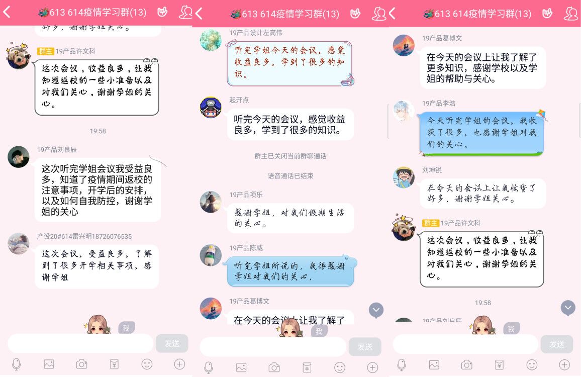 此次活动覆盖艺术学院所有非毕业班学生,辅导员助理们利用新媒体搭建平台,把寝室搬到云端,以“云端寝室”为载体,围绕同学们关心的话题,如“疫情期间我做的最有趣的事”、“我听过最感人的故事”“线上教学期间我的学习状况”、“在家与父母的关系如何”“线上班级活动感觉如何”、“开学后最想做的事”、“最想见的人”开展卧谈会。同学们“抗疫”宅家,数月未见,新颖的方式,吸引同学们积极参加。2018级环境设计2班的李言同学表示建立“云端寝室”,开展“云端”卧谈是辅导员助理带领同学们做的一次新颖的尝试和体验,伴随着同学们的各种分享,让一开始面对面的相顾无言,变成相谈盛欢,让大家十分期待线下相见的那天。2019级艺术与科技1班的朱文静同学表示,看到室友们熟悉的面孔,听到室友们熟悉的声音,无拘无束的畅聊着抗疫趣事,想念着华园的美景美食,对即将到来的返校复学激动不已。2019视觉传达1班郭广奇认为卧谈会进一步拉近了同学们彼此的距离,同学们畅所欲言,抒发了各自在疫情期间的感想,也诉说了对彼此的思念,是一次难得的心灵交流的机会。