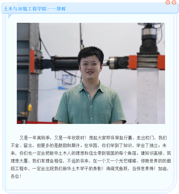精心准备,为毕业生送上殷切祝福。土木与环境工程学院2020届毕业生文明离校倡议书中深情寄语毕业生,满载的叮咛与希冀,“愿土木学子把握现在的大好青春,为了自己的未来努力奋斗,母校真诚祝愿你们大展宏图,前程似锦”。“一时的困境总会过去,一时的成功并不代表着常胜,人生就是一场持久战,最后的胜利一定是属于那些不忘初心,坚韧不拔,顺境不骄,逆境自强的人。毕业生代表表示将不辜负学院的期望与嘱托,从容不迫的应对人生中的每一道关卡。