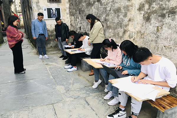 西递古村落呈船型,村中建筑鳞次栉比,学生们分组对村中九栋保存完整的古建筑进行测绘工作,利用全站仪、无人机、激光测距仪等先进仪器对古建筑进行测量工作,并当场绘制了建筑平面图、立面图、剖面图及大样图等。在此教学过程中,大家相互学习和交流,把课堂上的理论知识和课外的计算机辅助设计软件运用到测绘中,达到了较好的实践效果。